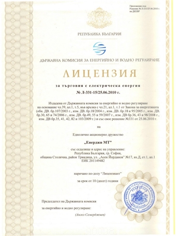 Energy MT EAD is licensed for the activity Electricity Trade for the period of 10 years issued by the Bulgarian Energy and Water Regulatory Commission (EWRC)on 25th June 2010.